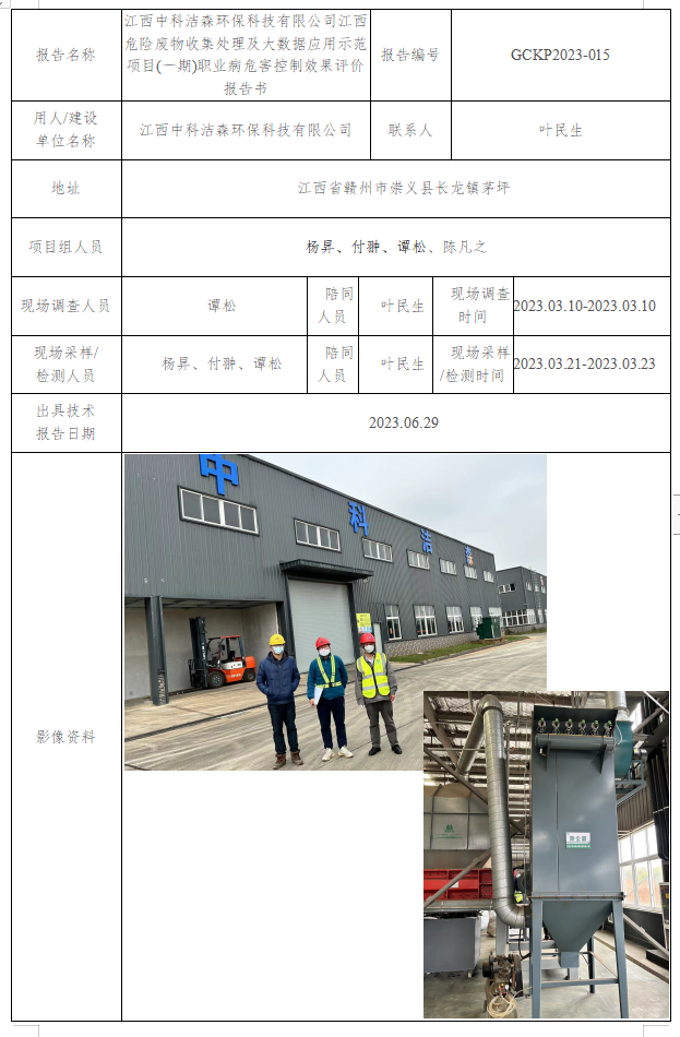 江西中科潔森環(huán)??萍加邢薰窘魑kU(xiǎn)廢物收集處理及大數(shù)據(jù)應(yīng)用示范項(xiàng)目(一期)職業(yè)病危害控制效果評(píng)價(jià)報(bào)告書GCKP2023-015