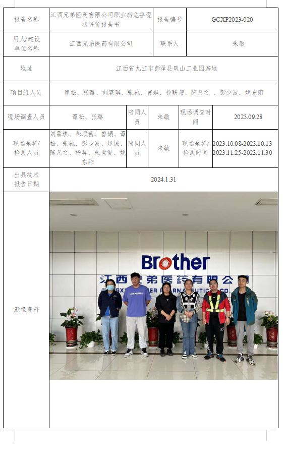 江西兄弟醫(yī)藥有限公司職業(yè)病危害現(xiàn)狀評價報告書GCXP2023-020