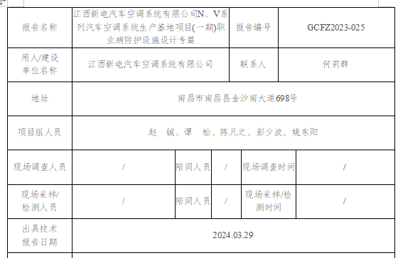 江西新電汽車空調(diào)系統(tǒng)有限公司N、V系列汽車空調(diào)系統(tǒng)生產(chǎn)基地項目(一期)職業(yè)病防護設(shè)施設(shè)計專篇GCFZ2023-025