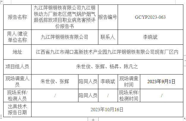 九江萍鋼鋼鐵有限公司九江鋼鐵動(dòng)力廠新老區(qū)燃?xì)忮仩t煙氣超低排放項(xiàng)目職業(yè)病危害預(yù)評(píng)價(jià)報(bào)告書GCYP2023-063