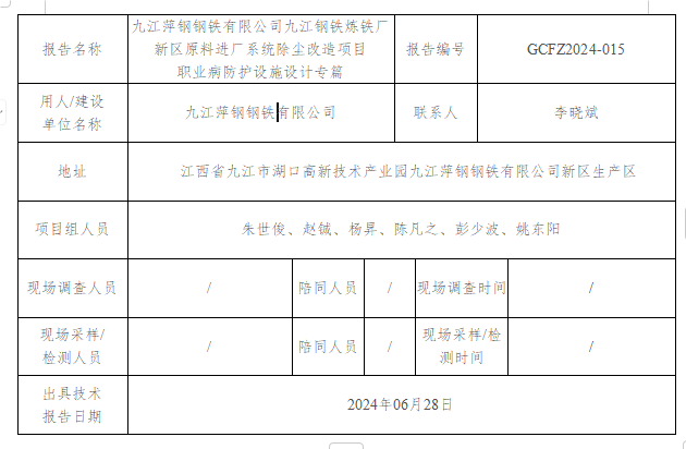 下一篇:九江萍鋼鋼鐵有限公司九江鋼鐵煉鐵廠新區(qū)原料新增一次配料除塵器項目 職業(yè)病防護設施設計專篇GCFZ2024-016