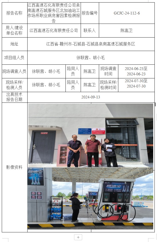 江西高速石化有限責(zé)任公司泉南高速石城服務(wù)區(qū)北加油站工作場所職業(yè)病危害因素檢測報告GCJC-24-112-6