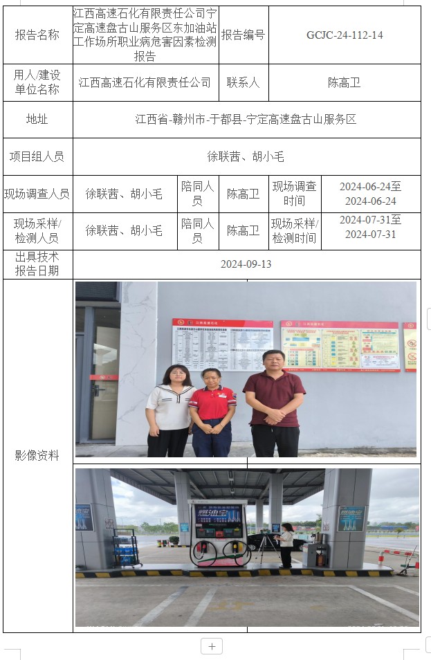 江西高速石化有限責(zé)任公司寧定高速盤古山服務(wù)區(qū)東加油站工作場所職業(yè)病危害因素檢測報告GCJC-24-112-14
