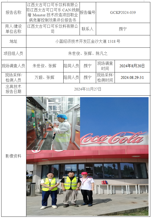 江西太古可口可樂飲料有限公司江西太古可口可樂CAN線新增Monster技術(shù)改造項目職業(yè)病危害控制效果評價報告書