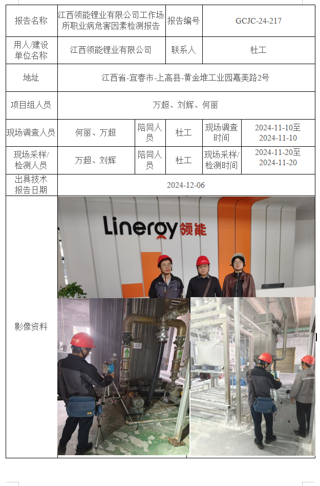江西領(lǐng)能鋰業(yè)有限公司工作場(chǎng)所職業(yè)病危害因素檢測(cè)報(bào)告