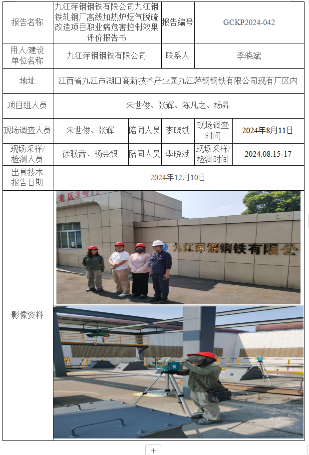 下一篇:九江萍鋼鋼鐵有限公司九江鋼鐵中板、高棒、優(yōu)鋼線、普棒加熱爐煙氣脫硫改造項(xiàng)目職業(yè)病危害控制效果評(píng)價(jià)報(bào)告書