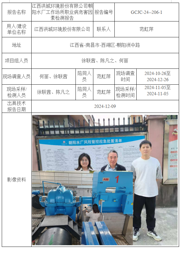 江西洪城環(huán)境股份有限公司朝陽水廠工作場所職業(yè)病危害因素檢測報告