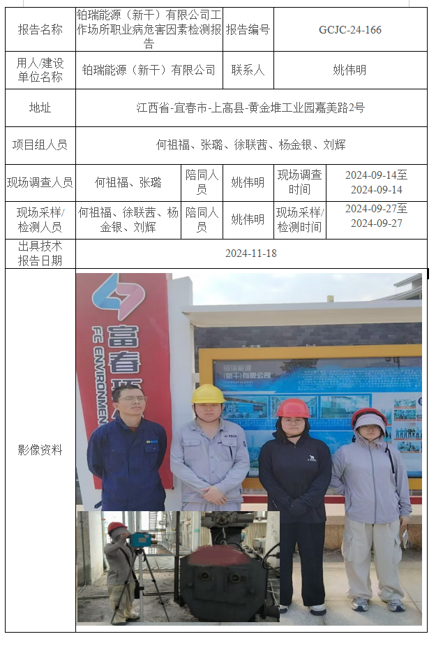 鉑瑞能源(新干)有限公司工作場所職業(yè)病危害因素檢測報告