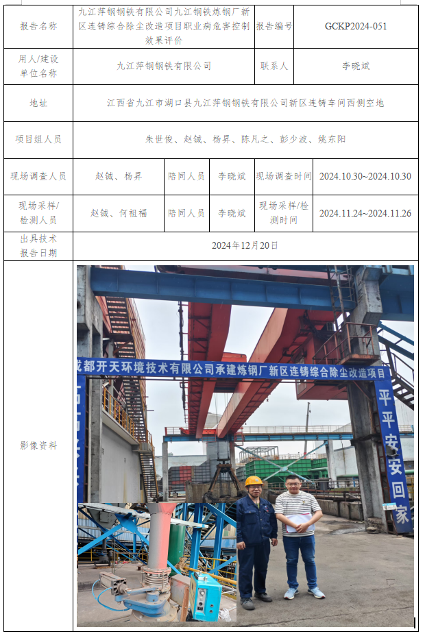 九江萍鋼鋼鐵有限公司九江鋼鐵煉鋼廠新區(qū)連鑄綜合除塵改造項(xiàng)目職業(yè)病危害控制效果評價