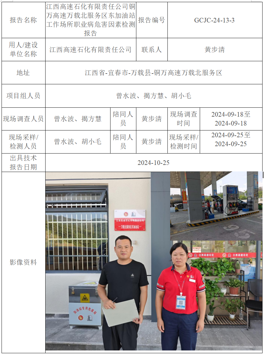 江西高速石化有限責任公司銅萬高速萬載北服務區(qū)西加油站工作場所職業(yè)病危害因素檢測報告