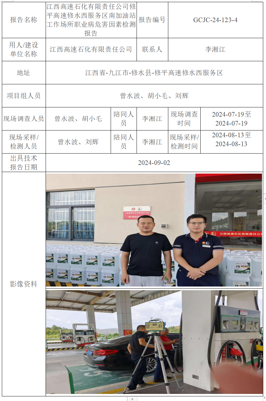 江西高速石化有限責(zé)任公司修平高速修水西服務(wù)區(qū)南加油站工作場所職業(yè)病危害因素檢測報告