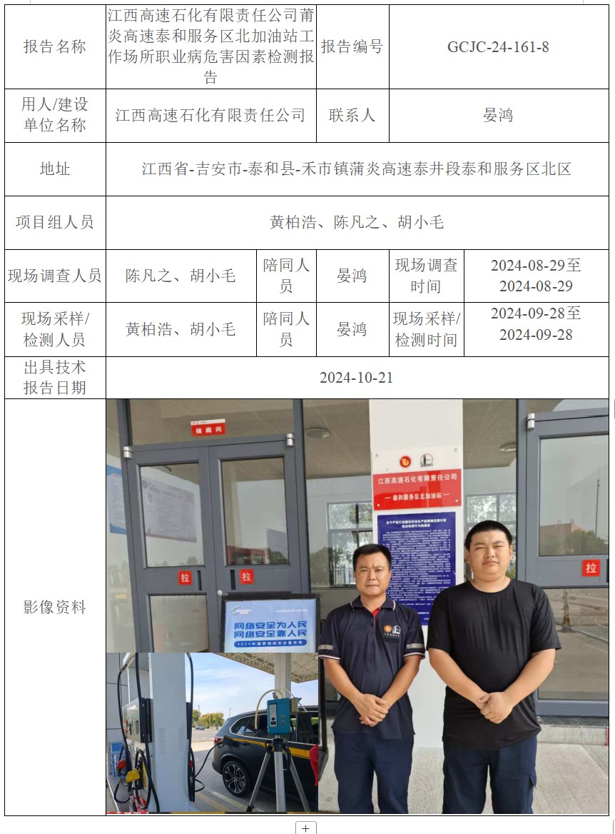 上一篇:江西高速石化有限責(zé)任公司莆炎高速泰和服務(wù)區(qū)南加油站工作場所職業(yè)病危害因素檢測報告