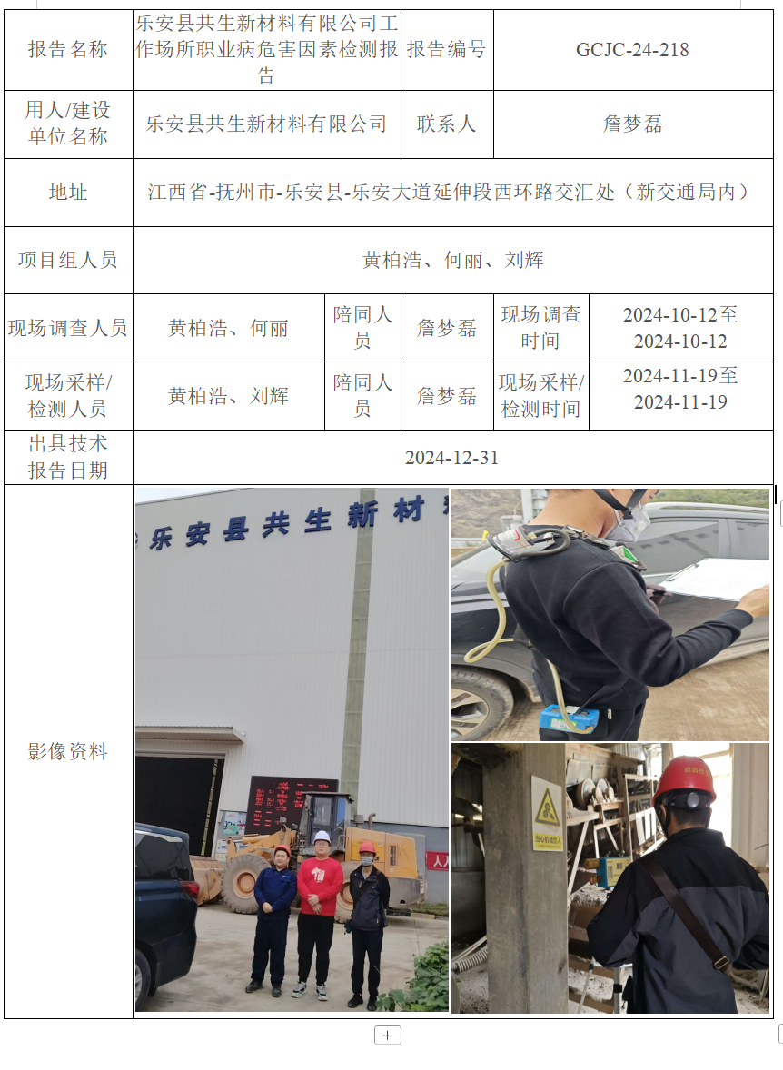 樂安縣共生新材料有限公司工作場所職業(yè)病危害因素檢測報告