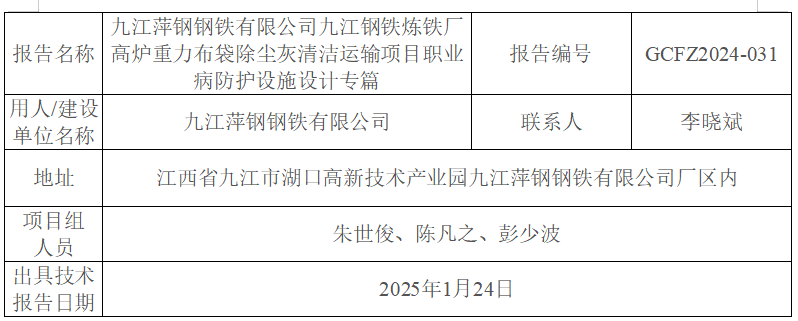 九江萍鋼鋼鐵有限公司九江鋼鐵煉鐵廠高爐重力布袋除塵灰清潔運輸項目職業(yè)病防護設施設計專篇