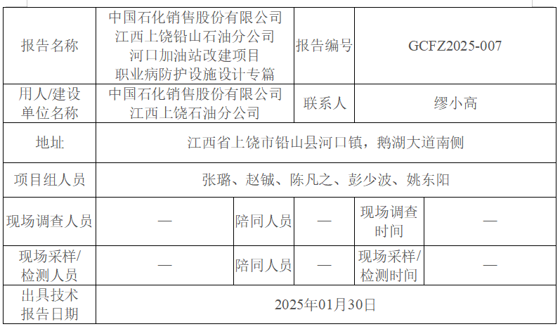 中國石化銷售股份有限公司 江西上饒鉛山石油分公司 河口加油站改建項目 職業(yè)病防護設(shè)施設(shè)計專篇