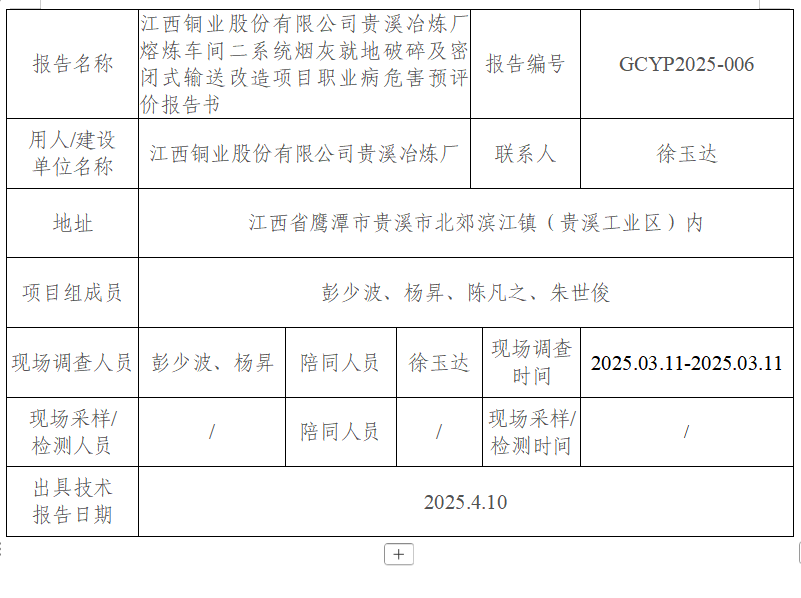 江西銅業(yè)股份有限公司貴溪冶煉廠熔煉車間二系統(tǒng)煙灰就地破碎及密閉式輸送改造項目職業(yè)病危害預評價報告書
