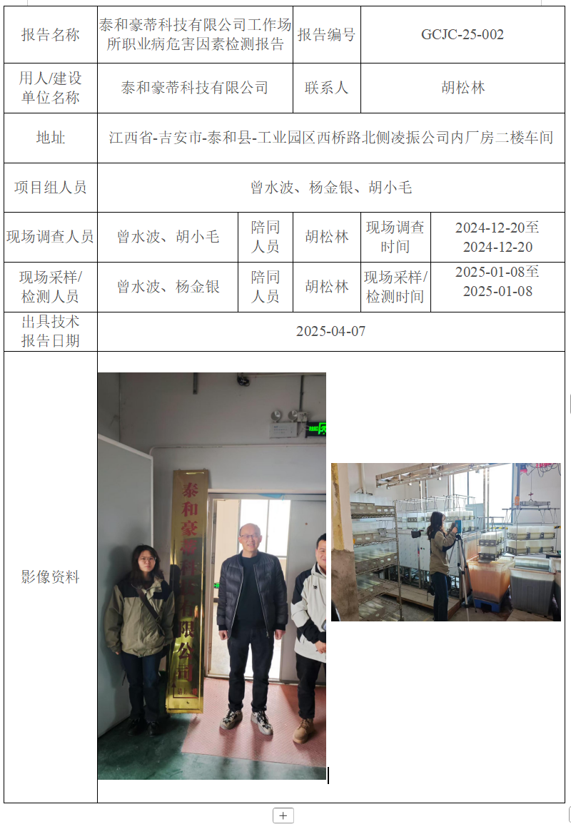 泰和豪蒂科技有限公司工作場所職業(yè)病危害因素檢測報告