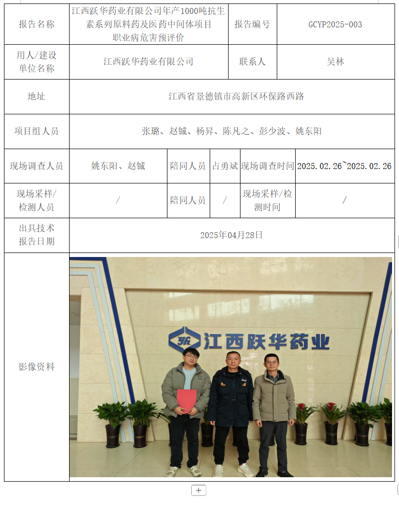江西躍華藥業(yè)有限公司年產(chǎn)1000噸抗生素系列原料藥及醫(yī)藥中間體項(xiàng)目 職業(yè)病危害預(yù)評價(jià)