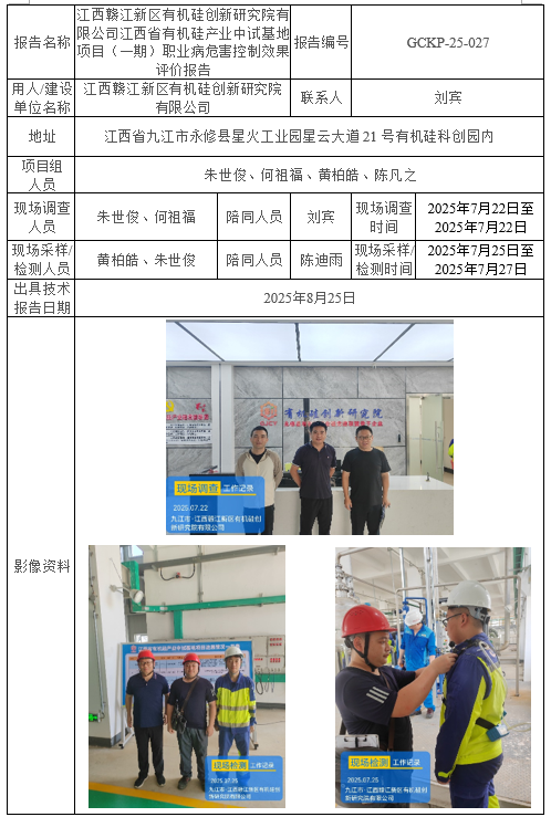 江西贛江新區(qū)有機硅創(chuàng)新研究院有限公司江西省有機硅產(chǎn)業(yè)中試基地項目(一期)職業(yè)病危害控制效果評價報告