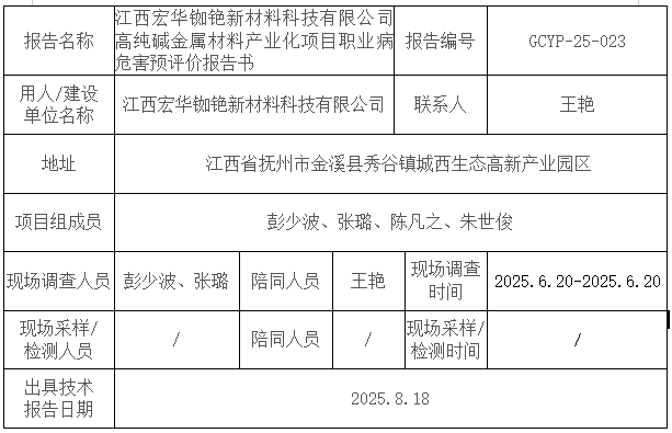 江西宏華銣銫新材料科技有限公司高純堿金屬材料產(chǎn)業(yè)化項目職業(yè)病危害預(yù)評價報告書