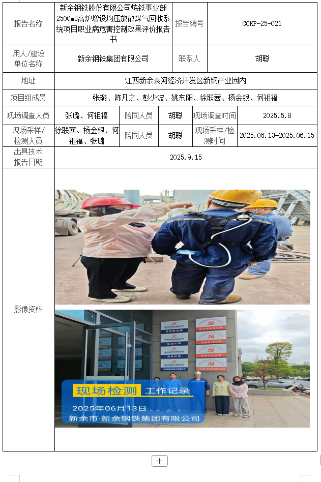 新余鋼鐵股份有限公司煉鐵事業(yè)部2500m3高爐增設均壓放散煤氣回收系統(tǒng)項目職業(yè)病危害控制效果評價報告書
