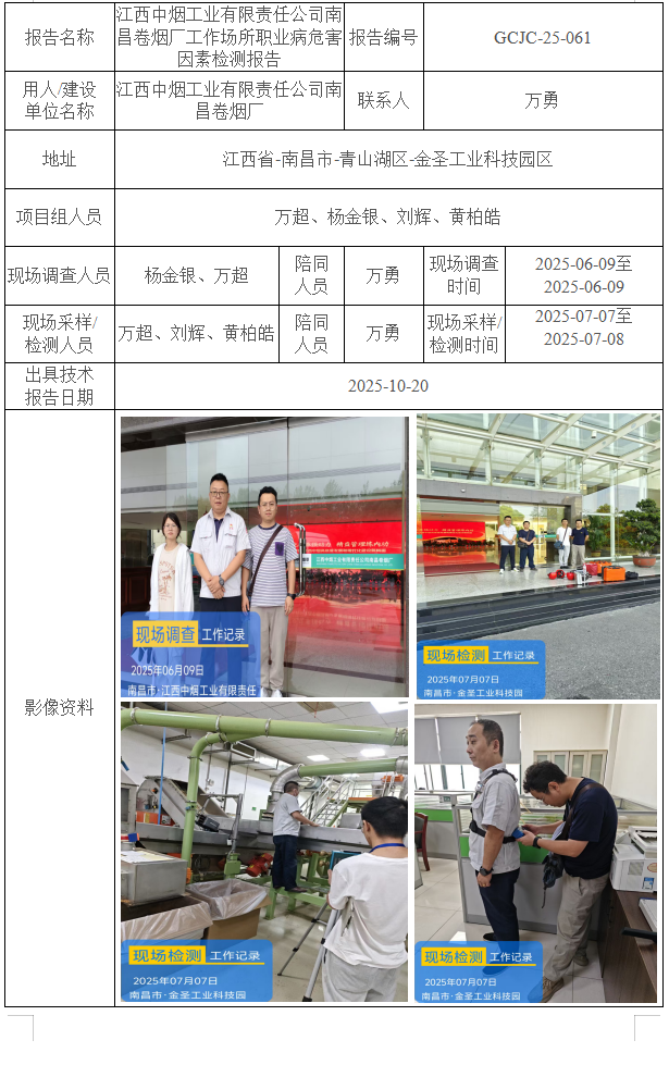 江西中煙工業(yè)有限責(zé)任公司南昌卷煙廠工作場所職業(yè)病危害因素檢測報告