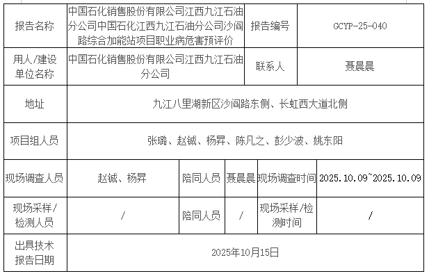 中國石化銷售股份有限公司江西九江石油分公司中國石化江西九江石油分公司沙閻路綜合加能站項目職業(yè)病危害預評價
