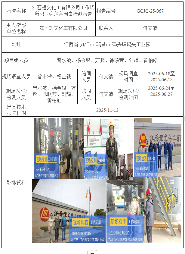 江西理文化工有限公司工作場所職業(yè)病危害因素檢測報告
