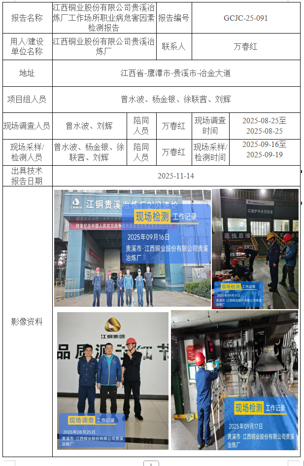 江西銅業(yè)股份有限公司貴溪冶煉廠工作場所職業(yè)病危害因素檢測報告