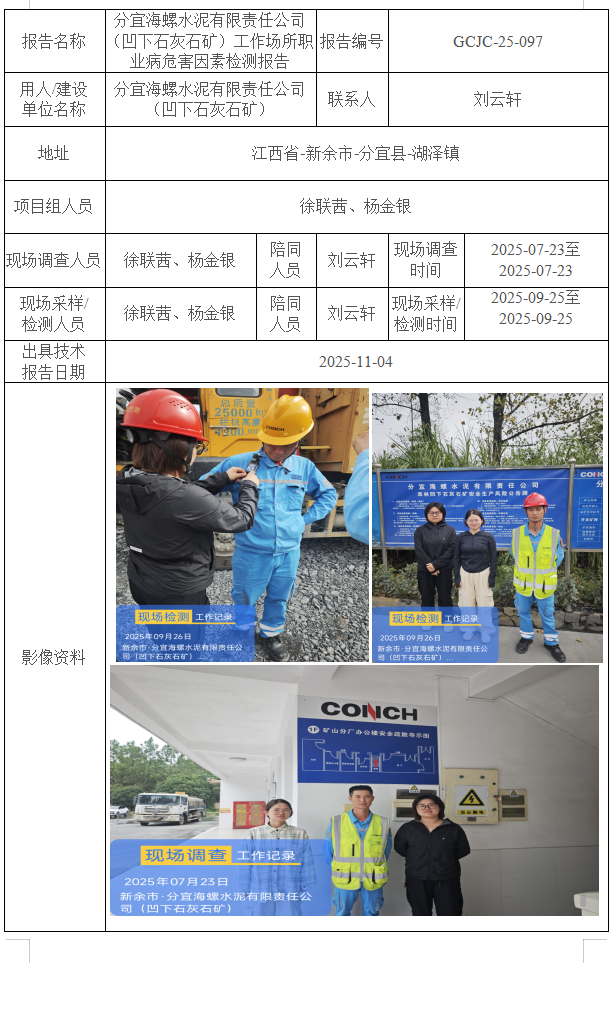分宜海螺水泥有限責任公司(凹下石灰石礦)工作場所職業(yè)病危害因素檢測報告