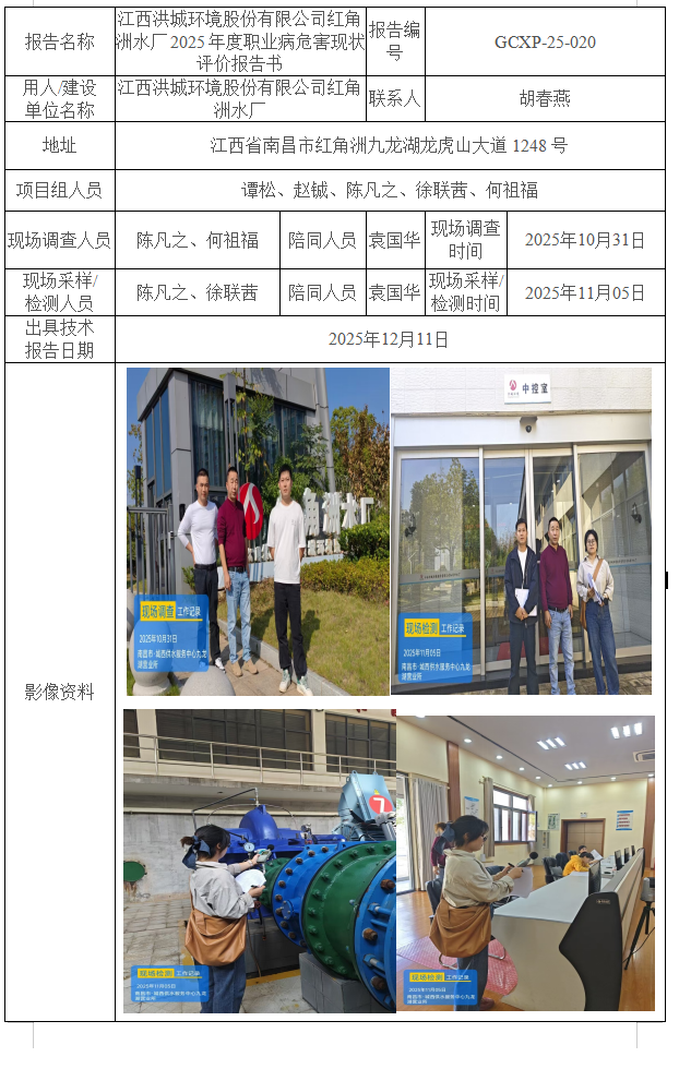江西洪城環(huán)境股份有限公司紅角洲水廠2025年度職業(yè)病危害現(xiàn)狀評價報告書