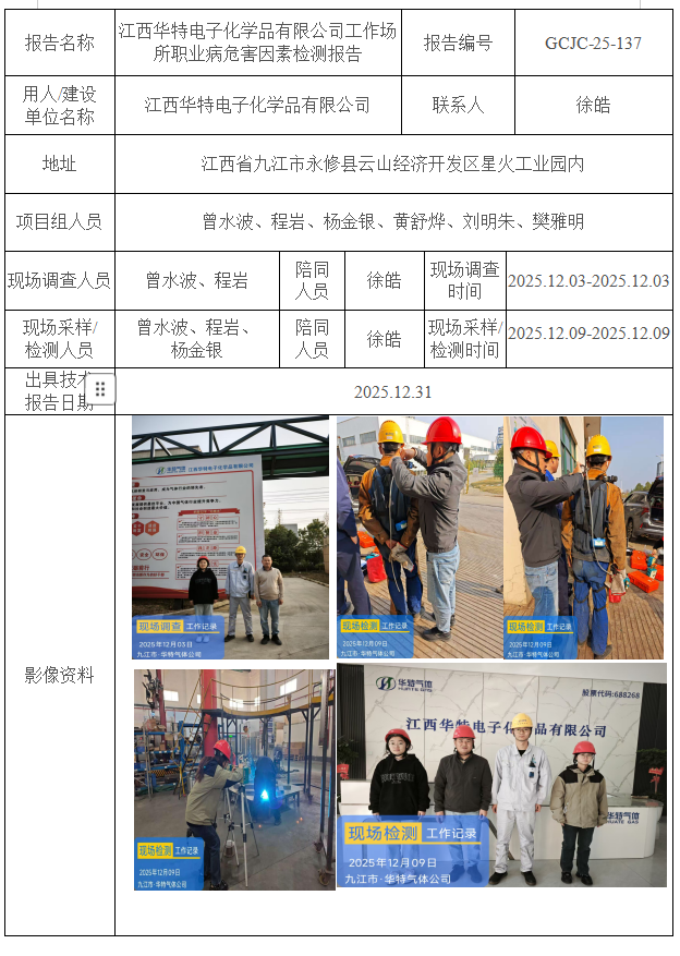 江西華特電子化學(xué)品有限公司工作場所職業(yè)病危害因素檢測報告