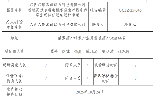 江西江銅嘉磁動力科技有限公司新建高效永磁電機示范生產(chǎn)線項目職業(yè)病危害預評價報告書