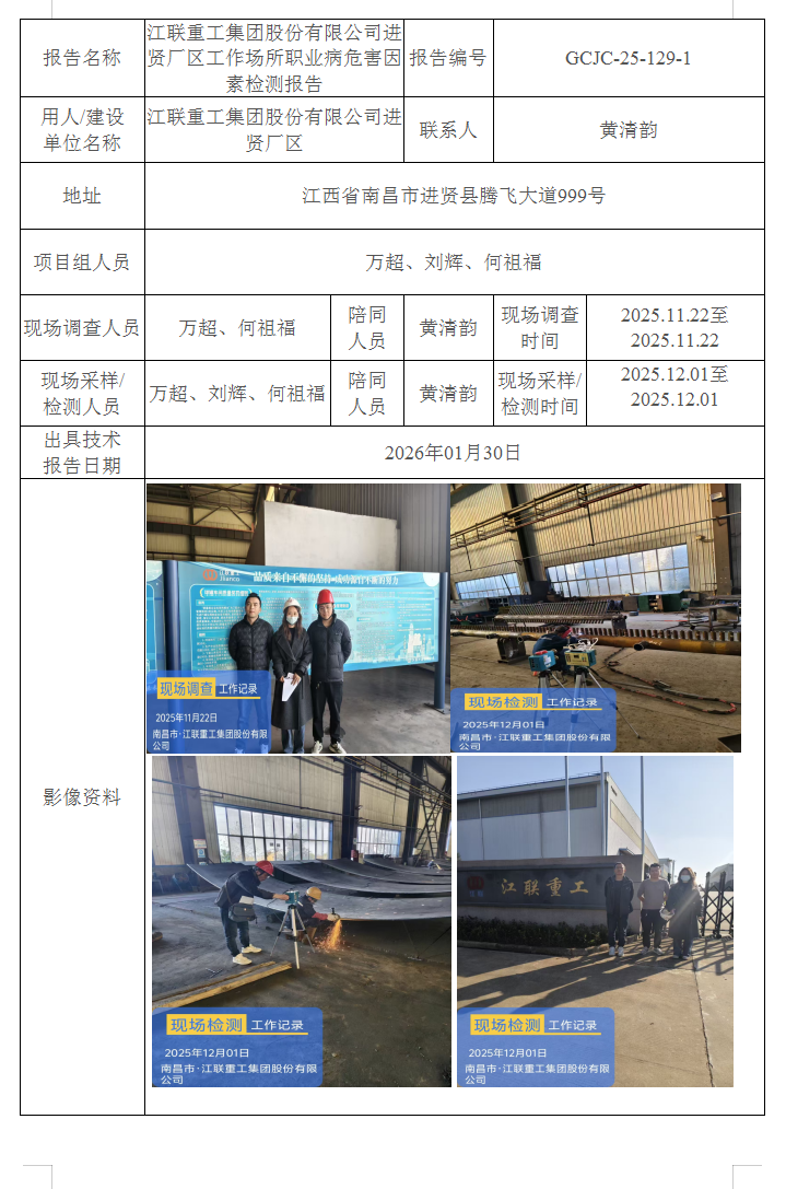江聯(lián)重工集團(tuán)股份有限公司進(jìn)賢廠區(qū)工作場(chǎng)所職業(yè)病危害因素檢測(cè)報(bào)告