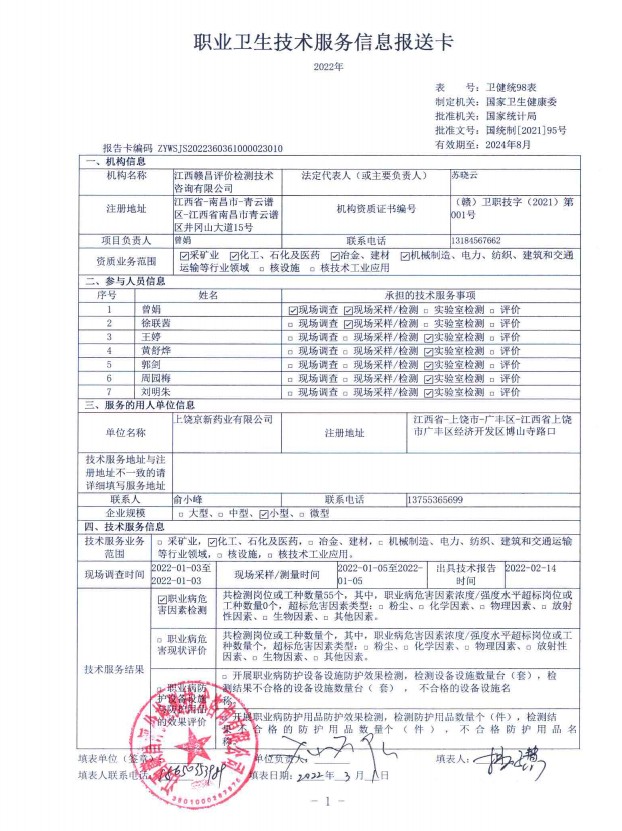 上饒京新藥業(yè)有限公司工作場所職業(yè)病危害因素檢測報告