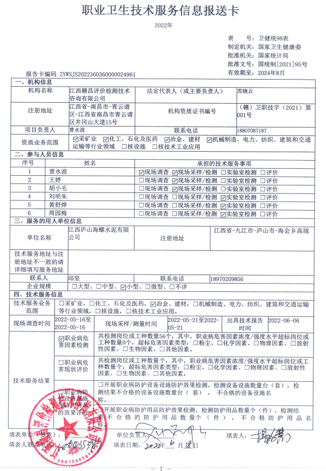 進賢海螺水泥有限責任公司工作場所職業(yè)病危害因素檢測報告