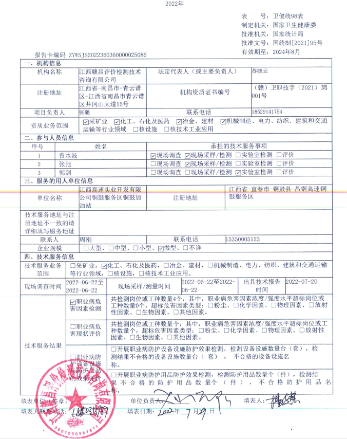 江西高速實業(yè)開發(fā)有限公司銅鼓服務區(qū)銅鼓加油站工作場所職業(yè)病危害因素檢測報告