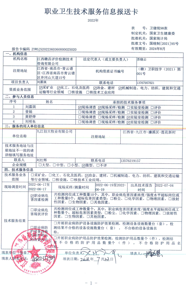 九江創(chuàng)大牧業(yè)有限公司工作場所職業(yè)病危害因素檢測報(bào)告