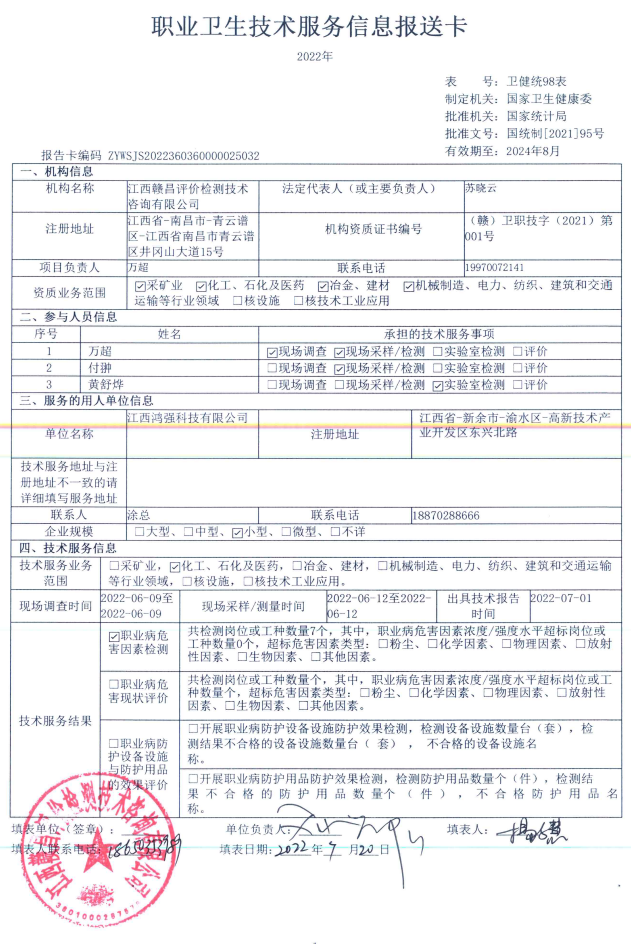 江西鴻強科技有限公司工作場所職業(yè)病危害因素檢測報告