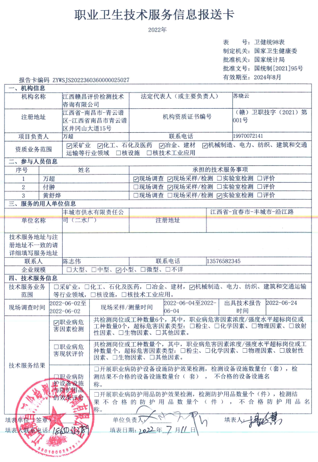 豐城市供水有限責(zé)任公司(二水廠)工作場所職業(yè)病危害因素檢測報(bào)告