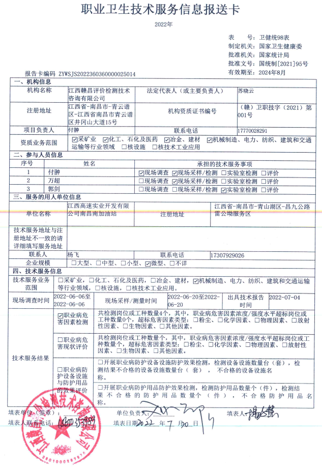 江西高速實(shí)業(yè)開發(fā)有限公司南昌南加油站工作場所職業(yè)病危害因素檢測報(bào)告